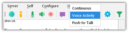 - New optional toolbar entry to select transmission modes (voice activation, push to talk, continuous). Needs to be activated in Configure -> Settings -> User Interface -> Show transmit mode dropdown in toolbar.